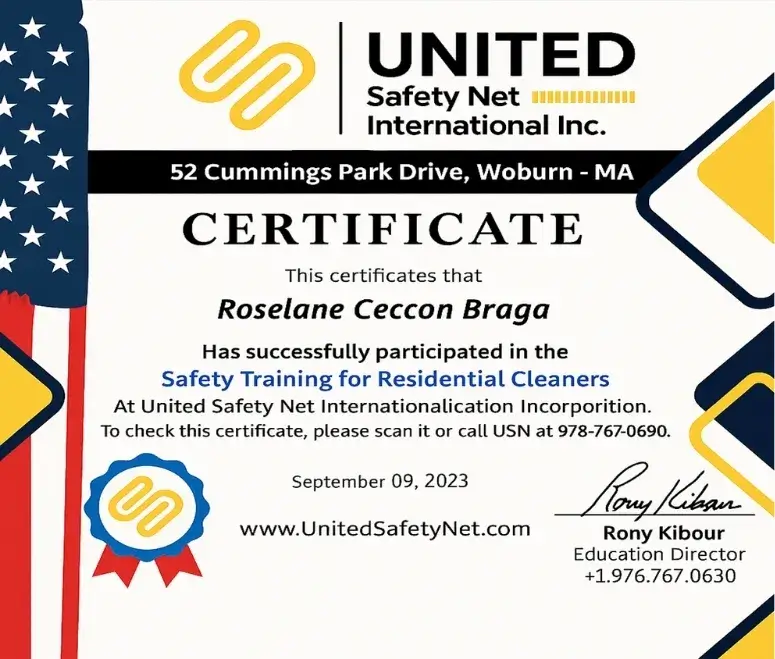 Braga Cleaning Services is certified in Safety Training for Residential Cleaners, following OSHA safety standards, through United Safety Net.